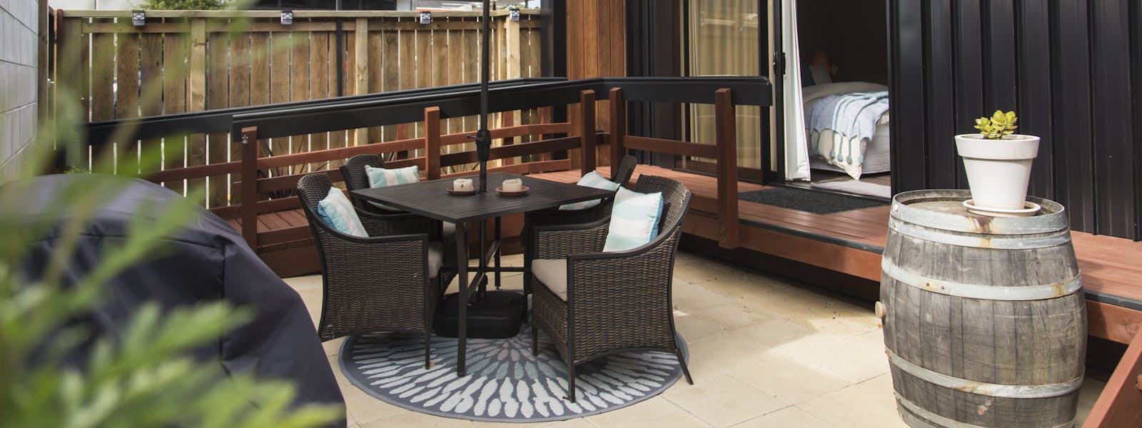 Located only 150 m from the beach, each room is beautifully interior designed with luxurious beds and linen. Enjoy the private courtyard, BBQ, outdoor table setting and tropical bamboo outdoor shower.